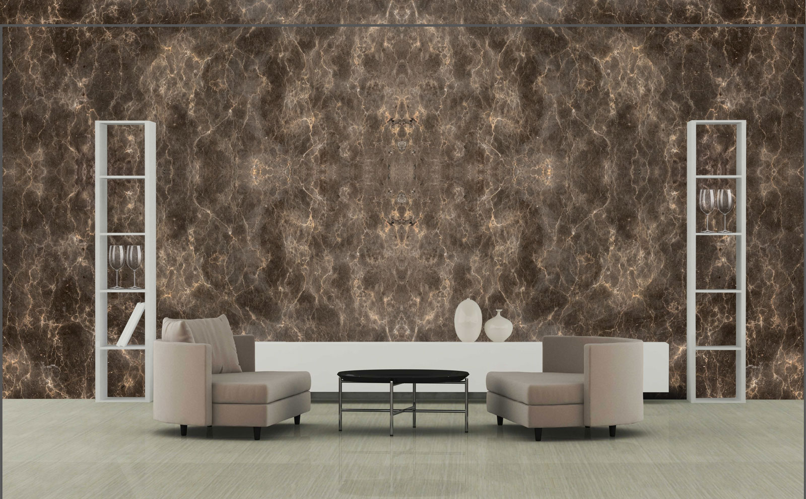 Его светлые прожилки будто освещают глянцевую поверхность мрамора благородного кофейного оттенка, наполняют его теплом и создают поистине впечатляющий узор, который хочется детально изучить.